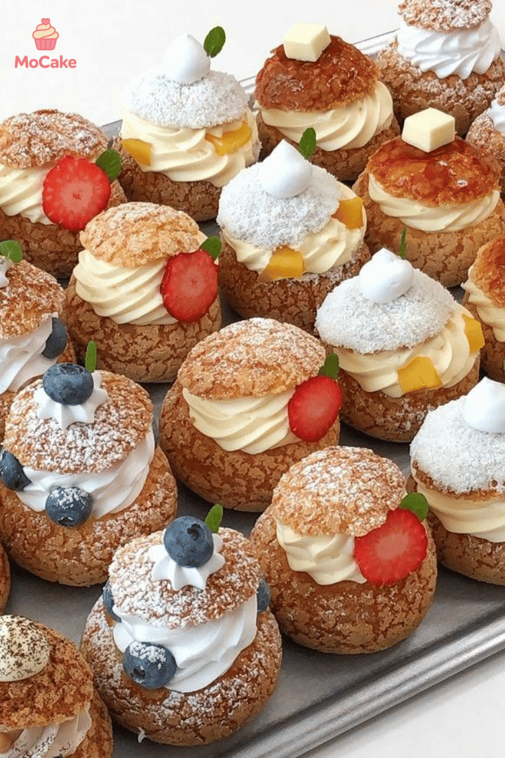 Su kem hoa quả – Vỏ mềm nhẹ, nhân kem mát kết hợp trái cây tươi, ăn thanh và cực dễ ghiền.
